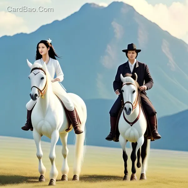 古风一男一女,骑在同一匹白马上,马头朝左,在漫步。女的在男的前边。以远山为背景,女的头微后仰,男的头微前倾,显出亲昵状。