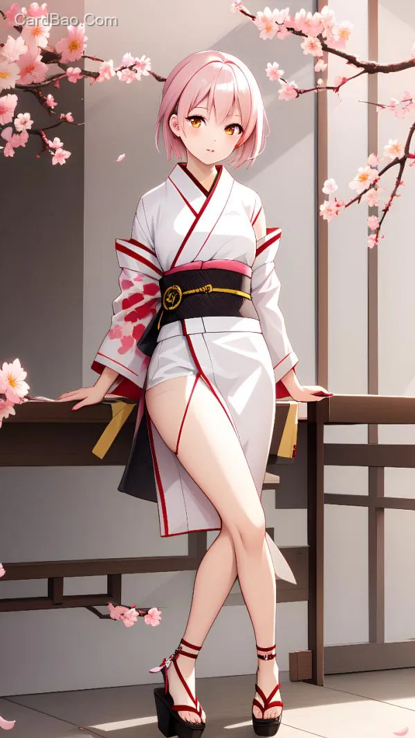 立绘,少女,白色短发发,少量红色挑染,粉色樱花现代和服,黄色眼睛,身材好,露腿,和式服装