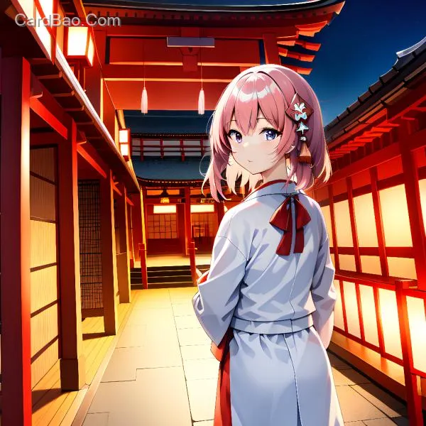 Japanese-style shrine maiden at a temple, turning back with a stunning glance