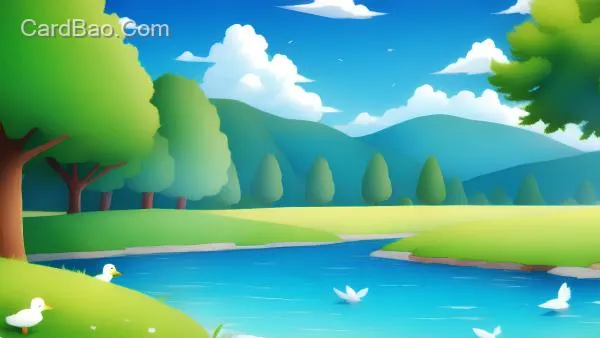 蓝天白云,小河边,有小草,有树,还有几只鸭子