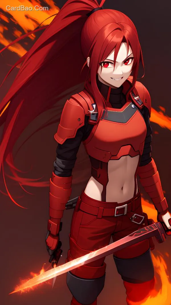 立绘,成女,高挑,深红色长发,单马尾,深红色瞳孔,短裤,露脐装,露肩装,微笑,大太刀,火刀,夜晚,火焰,战斗