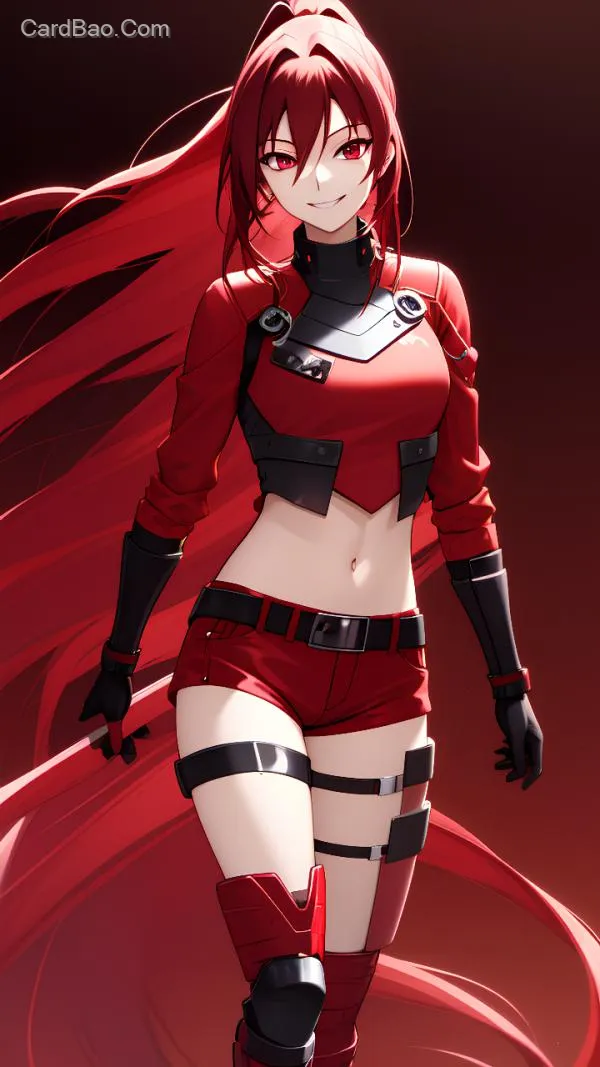 立绘,成女,高挑,深红色长发,单马尾,深红色瞳孔,短裤,露脐装,微笑,大太刀,战斗