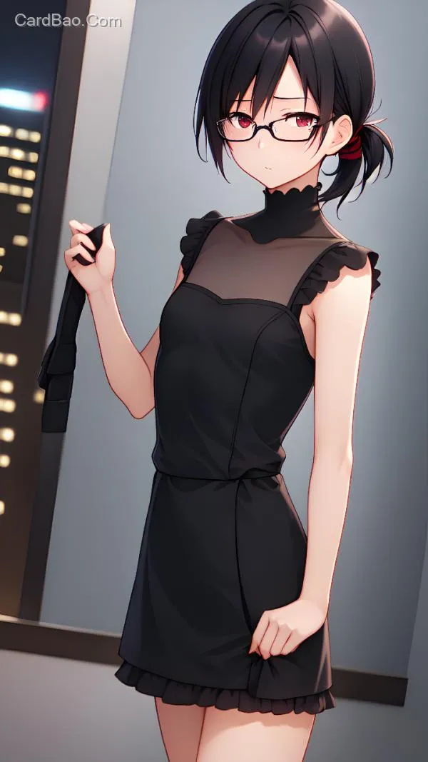 立绘,少女,平胸,平胸,贫乳,黑发,短发单马尾,女性管家服装,黑色眼镜,秘书,时尚服装,城市,夜景
