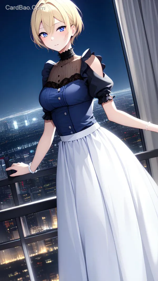 立绘,成女,女仆长裙,金色短发,蓝色瞳孔,城市,夜景,成熟,稳重