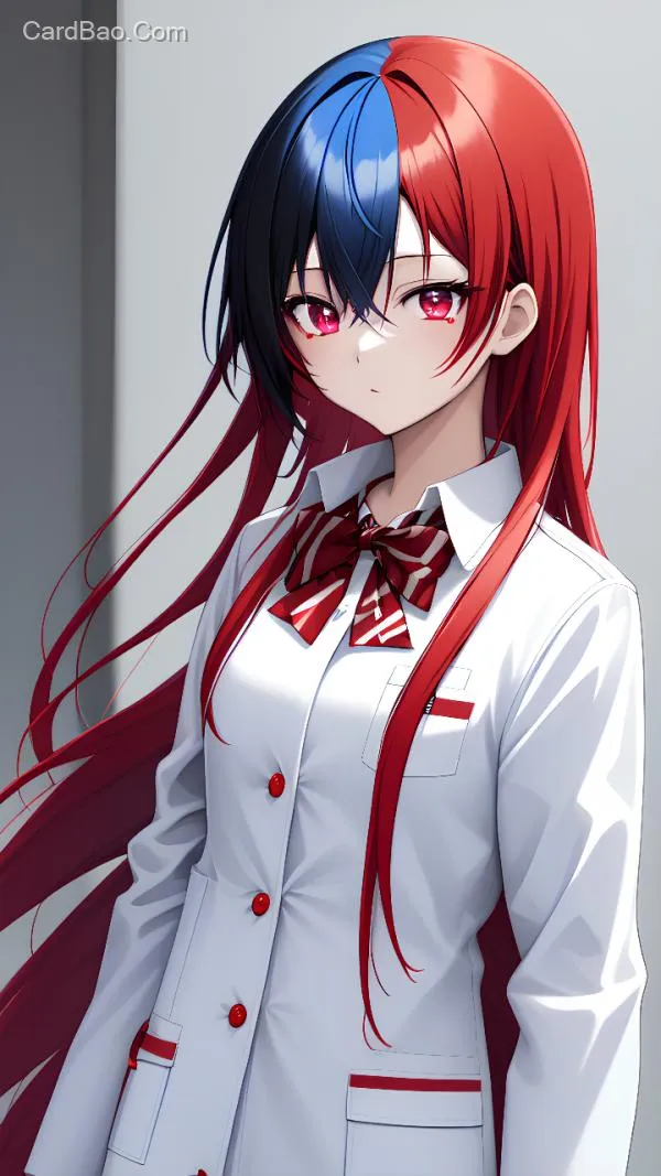 Character illustration, young girl, black hair, red and blue highlights, work attire, white coat, red and blue heterochromatic eyes, blue pupil.