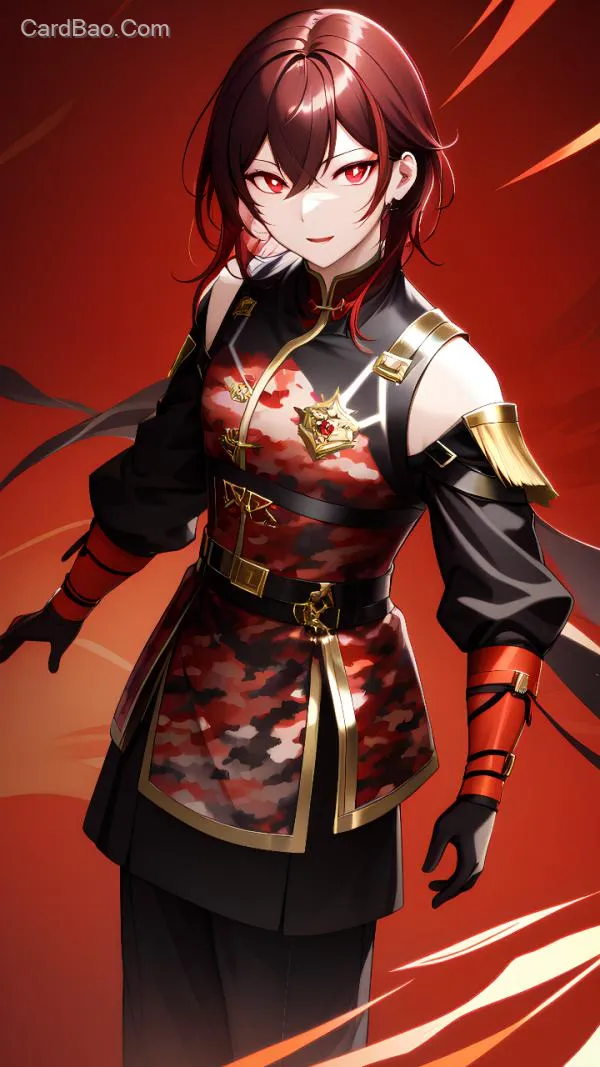 立绘,成女,黑红色军官装,深红色头发,淡黄色瞳孔,金色臂章,成熟,中年