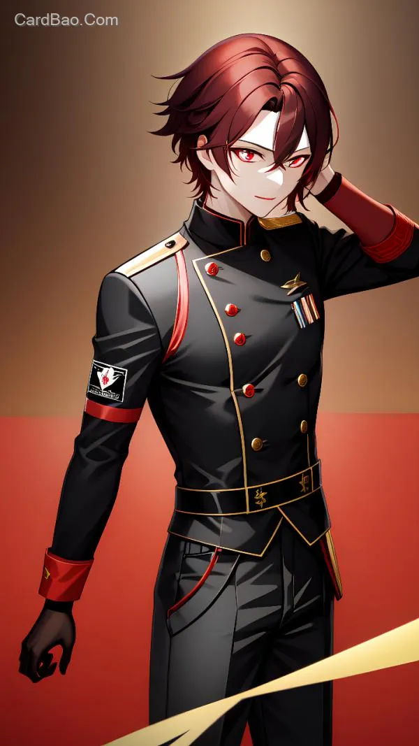 Standing illustration, adult female, woman, formal black and red military officer uniform, deep red hair, pale yellow pupils, golden armband, mature, laboratory background.
