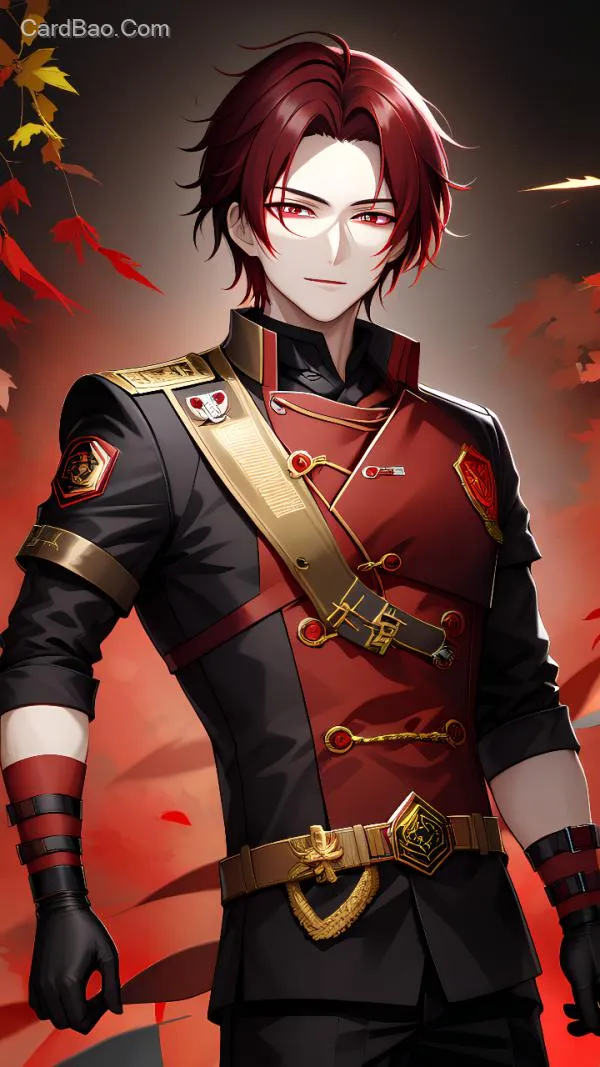立绘,成女,正式黑红色军官装,深红色头发,淡黄色瞳孔,金色臂章,成熟,中年,实验室