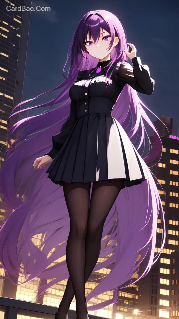 立绘,少女,长发,紫色头发,夜景,繁华都市,黑色瞳孔,黑帮大小姐,紫色百褶长裙,现代风,露腿,黑色上衣,冷漠,裤袜,黑宝石项链