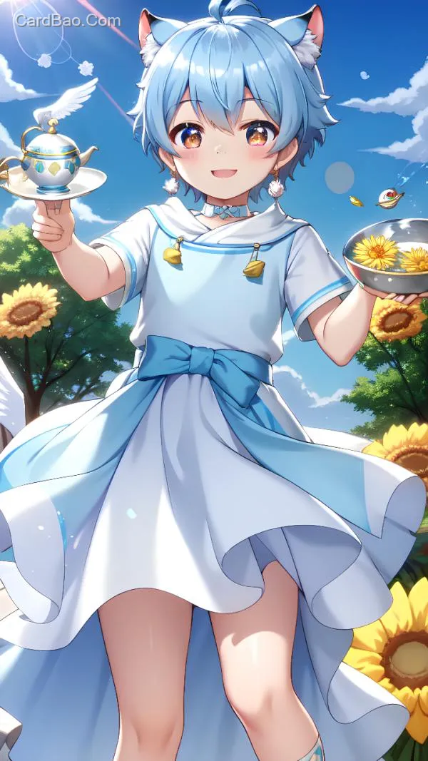 拿着天平,天秤,淡蓝色头发的怂鼠,白色公主裙,午后阳光,白鸽,微笑,波斯菊,清新洛可可