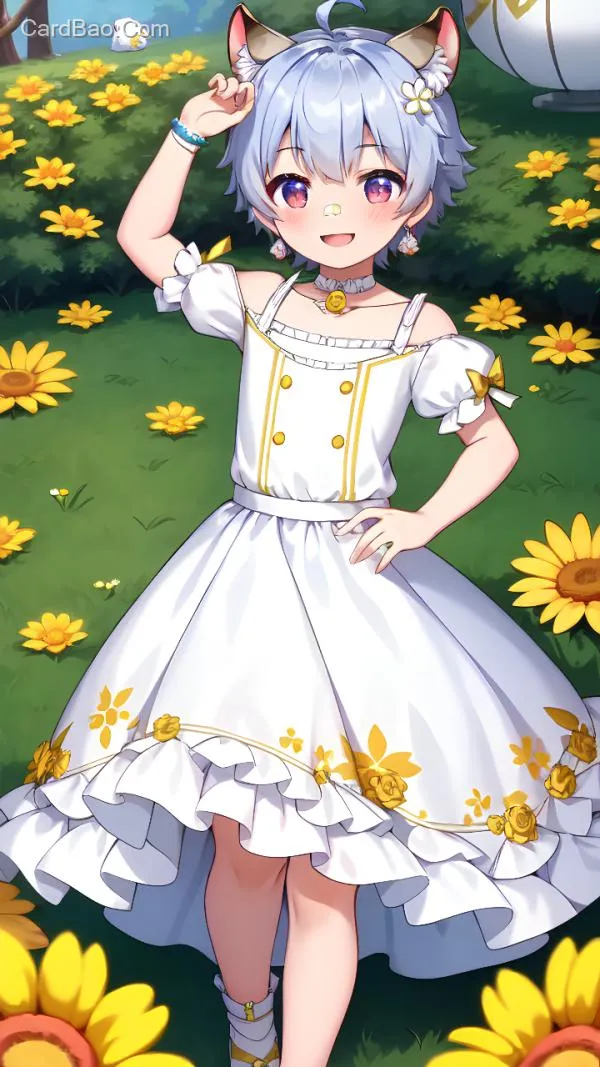 两个人,两个浅黄色短头发的怂鼠,白色公主裙,微笑,小雏菊,洋槐花,紫玫瑰,花园,清新洛可可