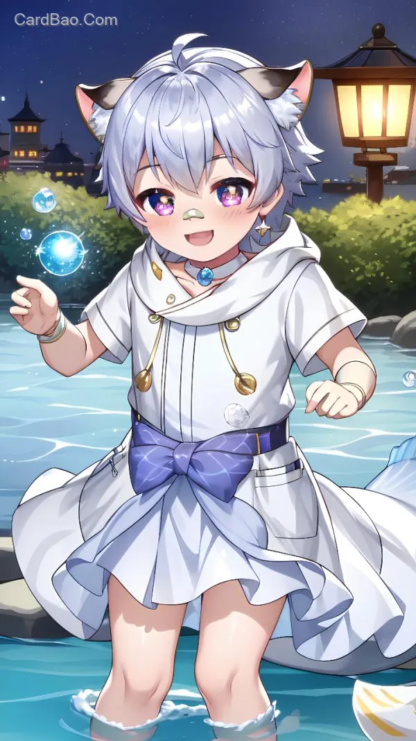 很多鱼,白鱼,池塘,白色头发的美人鱼,怂鼠,鱼鳞白色公主裙,微笑,珍珠,贝壳,银灰色,紫罗兰,夜晚,清新洛可可