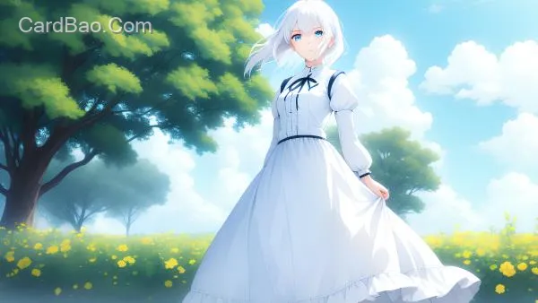 A white-haired girl with blue eyes stands against the wind, gazing into the distance.