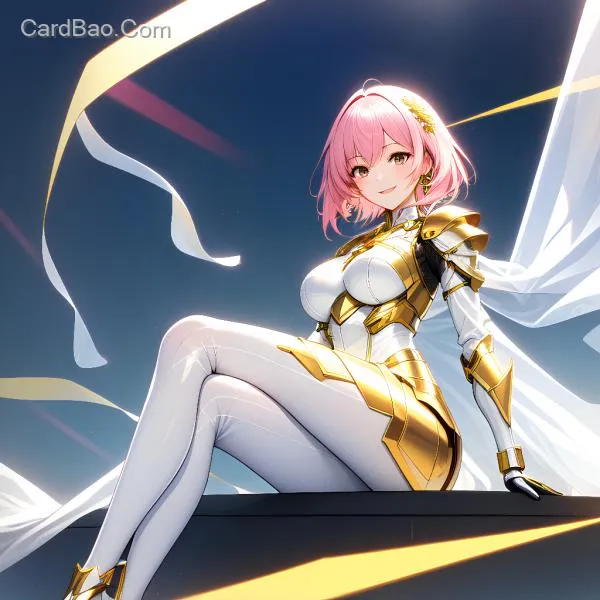Mecha girl, energetic, wearing a translucent platinum bodysuit, with a transparent golden cape, set against a futuristic city background. She has pink hair, a perfect figure, and an innocent appearance. The image is of the highest quality, featuring a golden choker, leg bands, and detailed accessories with a strong three-dimensional effect. The overall resolution is ultra-high definition, with clear accessory details. The background includes a blue sky, and the scene is meticulously detailed. She stands gracefully, showcasing an "absolute territory" style with white thigh-high socks. She is seated, wearing golden shoes, and smiling.