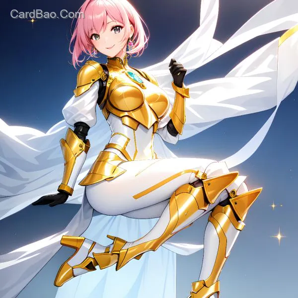 Mecha girl, energetic, wearing a white-gold semi-transparent bodysuit, with a transparent golden cape. Set against a futuristic city background, she has pink hair and a perfect figure, exuding a pure and innocent vibe. Rendered in the highest quality, she wears a golden choker, leg rings, and accessories with clear, detailed craftsmanship. The image has a strong three-dimensional feel and is ultra-high definition. The background features a blue sky, and the details are meticulously depicted. She stands gracefully, showcasing an "absolute territory" with white thigh-high socks. She is seated, wearing golden shoes, and has a gentle smile.