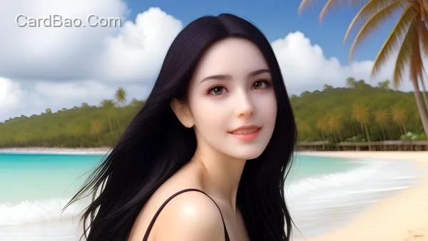 Swimsuit, long straight black hair, girl, stunning, master-level, flawless, beach, coconut trees, ocean waves, joyful, ultra-high definition, CG, masterpiece, intricate details, extremely detailed.