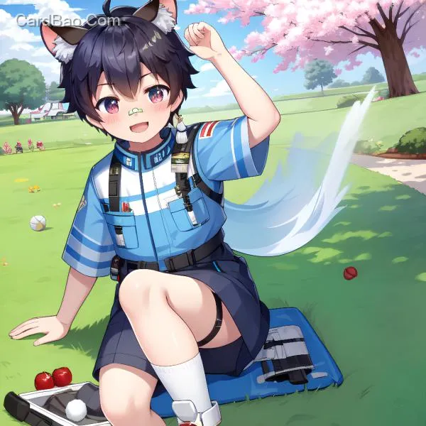 Timid mouse, blue sky, white clouds, school uniform, under the cherry blossom tree.