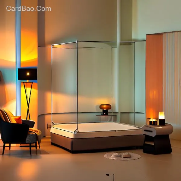 支架蚊帐,卧室,床头灯,仰视视角,暖色调,超现实风格,影棚打光,3D建模,高细节