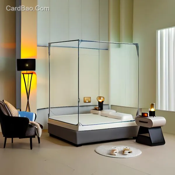 支架蚊帐,卧室,床头灯,暖色调,超现实风格,影棚打光,3D建模,高细节