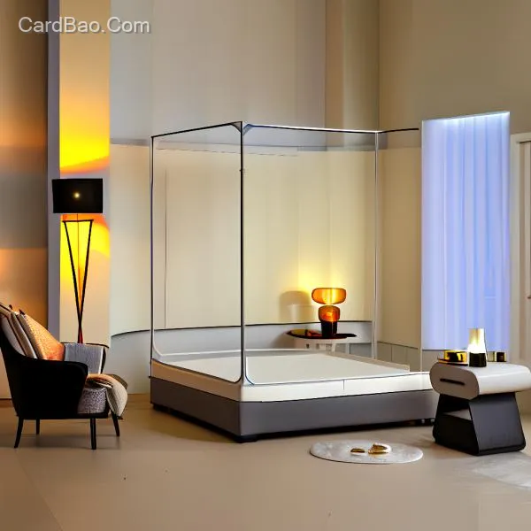 支架蚊帐,卧室,床头灯,暖色调,超现实风格,影棚打光,3D建模,高细节