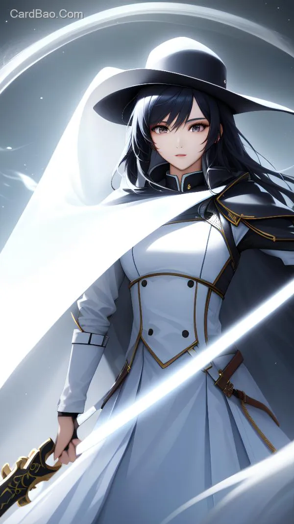 长发飘飘的女侠客,头戴斗笠,白衣,黑色披风,手持一把长剑,超高清