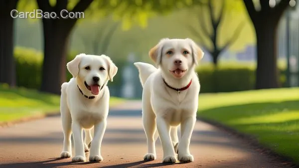 小玉在公园小路上遛白色拉布拉多犬,轮廓光线,绝美细节,静物超清写实,立体感