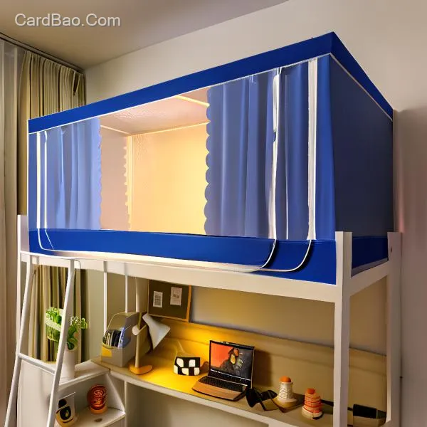 Student dormitory, blue mosquito net, low-angle perspective, realistic style