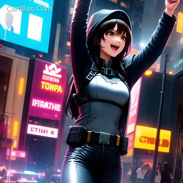 市民们齐心协力,成功阻止了邪恶组织的阴谋。画面中大家欢声雷动,男性蝙蝠侠举起拳头,脸上开心地激情地庆祝。最后市民们围绕着蝙蝠侠一起合影,一起拍照留念庆祝这个胜利时刻,展示出这座城市的团结和力量。