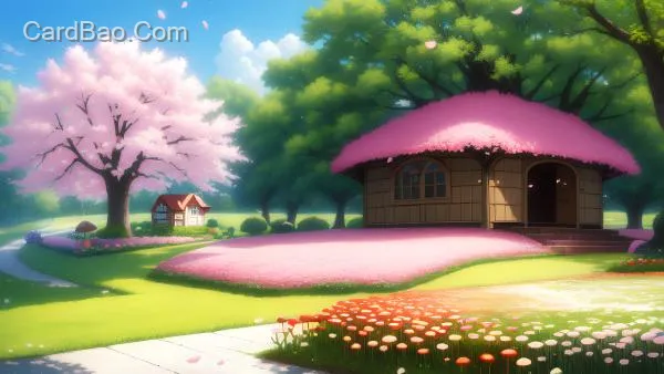 Spring, flowers, cherry blossom trees, petals dancing in the air, a cute mushroom house.