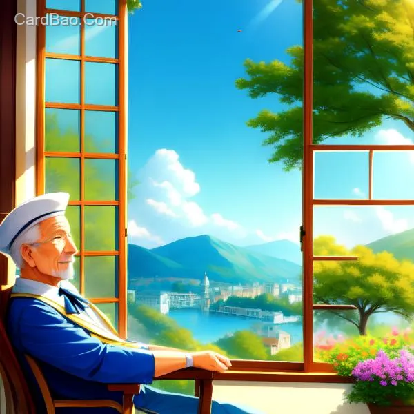 一位老人坐在落地窗旁,阳光撒入落地窗,整个画面干净明亮