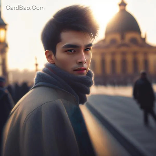 Character Portrait: Chinese handsome man with thick eyebrows and big eyes, gentle gaze, looking back, wearing a scarf and winter clothes. Shot with side backlighting in an empty Prague square, showcasing the Tyndall effect with scattered sunlight. Eye-level perspective, high contrast lighting, Japanese-style photography, Japanese aesthetic, large aperture, 8K high definition.