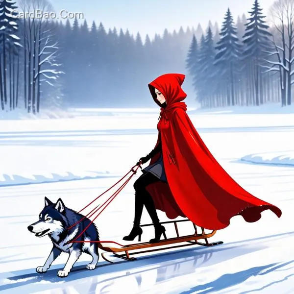 小红帽来到铁岭,骑着狼拉的雪橇在冰上,寒冬季节,大红披风,全身,偶像漫画风