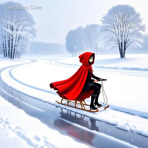 小红帽来到铁岭,骑着狼拉的雪橇在冰上,寒冬季节,大红披风,全身,偶像漫画风
