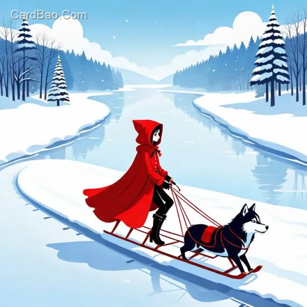 小红帽来到铁岭,骑着狼拉的雪橇在冰上,寒冬季节,大红披风,全身,偶像漫画风