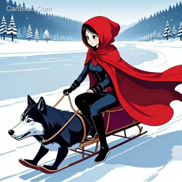 小红帽来到铁岭,骑着狼拉的雪橇在冰上,寒冬季节,大红披风,全身,偶像漫画风