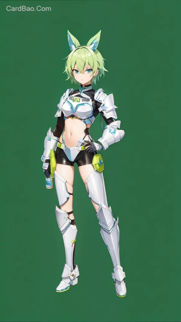 淡绿色头发,蓝色铠甲,一位淡绿色短发的少女,蓝色眼睛,格斗家,由红色与黄色进行少许点缀的蓝色铠甲,紧身衣,长裤,黑丝裤袜,高筒靴,拳套,空手。