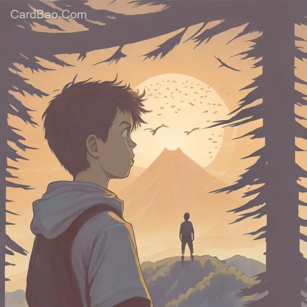 画一个男孩站在山顶上,眺望遥远美丽的大山还有森林,给人一种回忆的感觉,有质感,优美,男孩一定要仿照我上传例图中的,图中男孩的衣服要较长,仿照例图中的衣服,青春初三男孩,身高不要特别高,初中校服的尺寸就行,像例图中的衣服,上衣穿着大衣,色彩鲜艳
