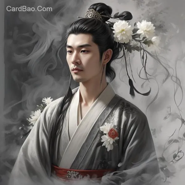 Ancient Chinese man, half-body, flowers, delicate facial features, ancient hair accessories, gray background, white smoke.
