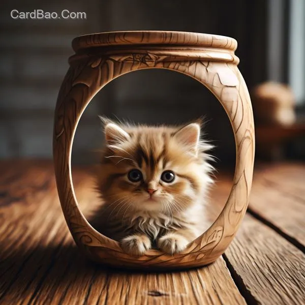 A ceramic jar in the shape of a small cat on a wooden table, aesthetically pleasing.