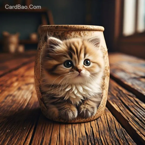 A ceramic jar in the shape of a small cat on a wooden table, aesthetically pleasing.