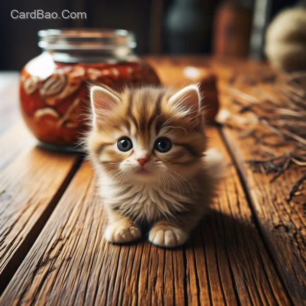 A ceramic jar in the shape of a small cat on a wooden table, aesthetically pleasing.