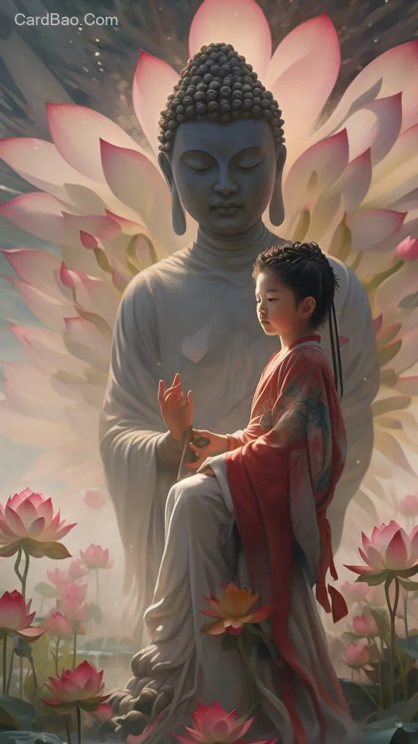 Amitabha Buddha stands on a lotus flower, holding a lotus in hand, gently touching a child's head. His eyes are extremely beautiful and full of grace.
