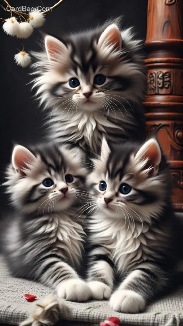 我家有三只活泼可爱的小猫,一只全黑色的爸爸,一只灰白相间粉爪肉垫的妈妈,一只全灰色的儿子,它们是相亲相爱的一家子。