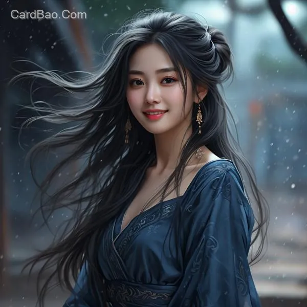 Dark blue clothing, beautiful woman, long hair, straight hair, ethereal aura, full body, smiling, 4K resolution.