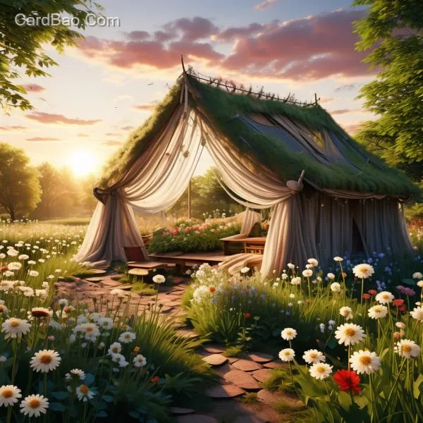 Thatched shed, light gauze curtains, wildflowers, aesthetic