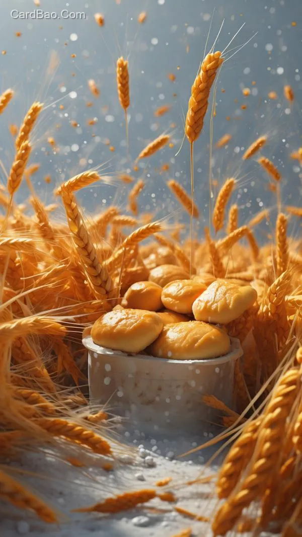 五谷丰登年糕,漂亮可爱,柔软黏糯,半透明,极光色彩,光泽靓丽,唯美梦幻,雾化效果,糕点质感,明亮稻穗麦穗糖霜色调,白色白色背景,极简,超现实