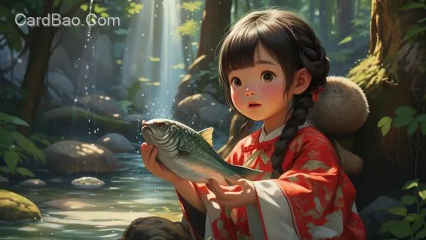森林里,小姑娘拿着一条鱼,问熊熊要不要。