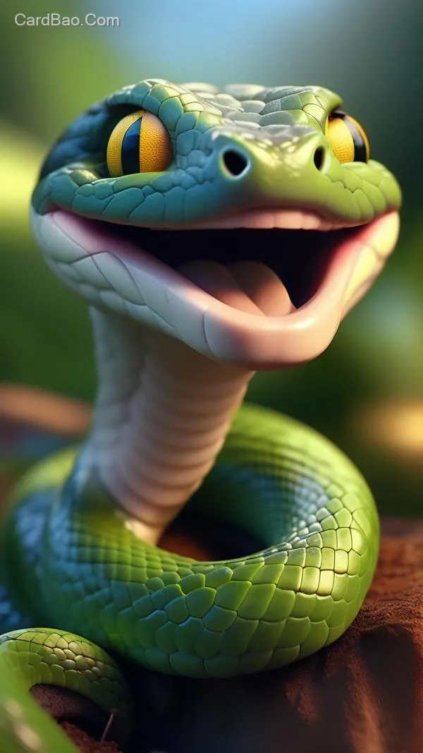 A cute, smiling little snake, 3D, CG, laughing heartily, ultra-high resolution, with delicate texture.
