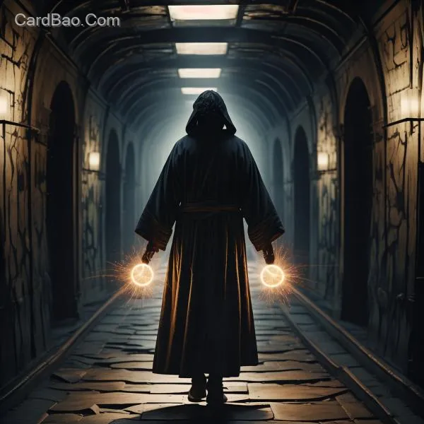 A European man in a long robe, back view, holding a glowing orb in a dark tunnel.