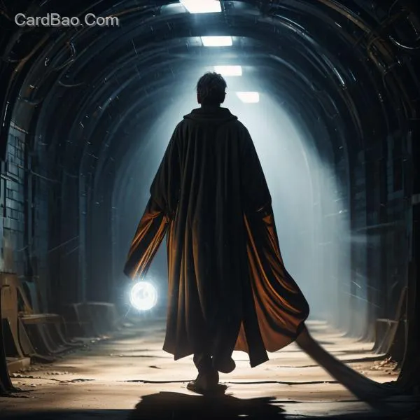 A European man in a long robe, holding a glowing sphere, standing in a dark tunnel, viewed from behind.